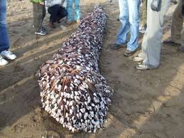 Hewan teritip – berbentuk memanjang atau berpendula, ditutupi oleh semacam kulit kerang – biasanya ditemukan di kedalaman lautan, tapi yang satu ini terdampar di pesisir panjang bebentuk seperti kayu gelondongan.